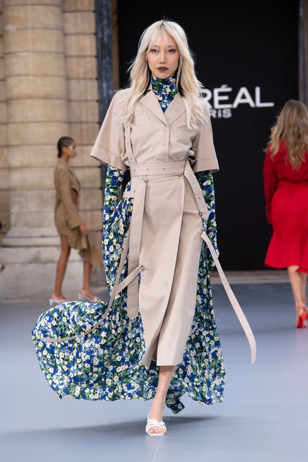 随后,韩国超模代言人 Soo Joo Park 以鲜明的碎花图案对比自然卡其色短袖风衣造型震撼登场,亚麻白色的 发型展现出个性不羁又摩登俏丽的时髦形象。妆效也如同着装般前卫大胆,精致亮白的底妆搭配碳黑色的犀利眼线 与暗红的唇色演绎当代流行混合文化。