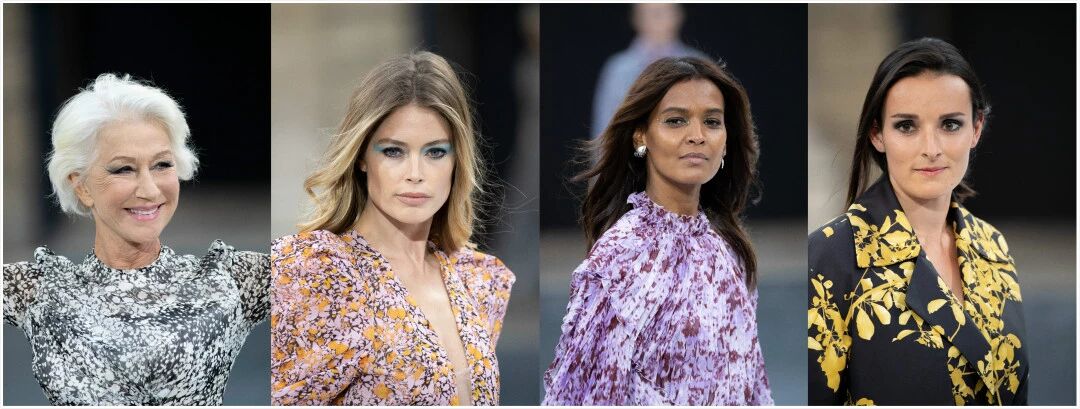 整个大秀最令人难忘的莫过于 74 岁的奥斯卡影后 Helen Mirren。白皙的凝脂底妆,简约的眼线勾勒出她眼神 中坚毅、朝气的神采,珊瑚色唇妆点亮轻松唯美的自然效果。