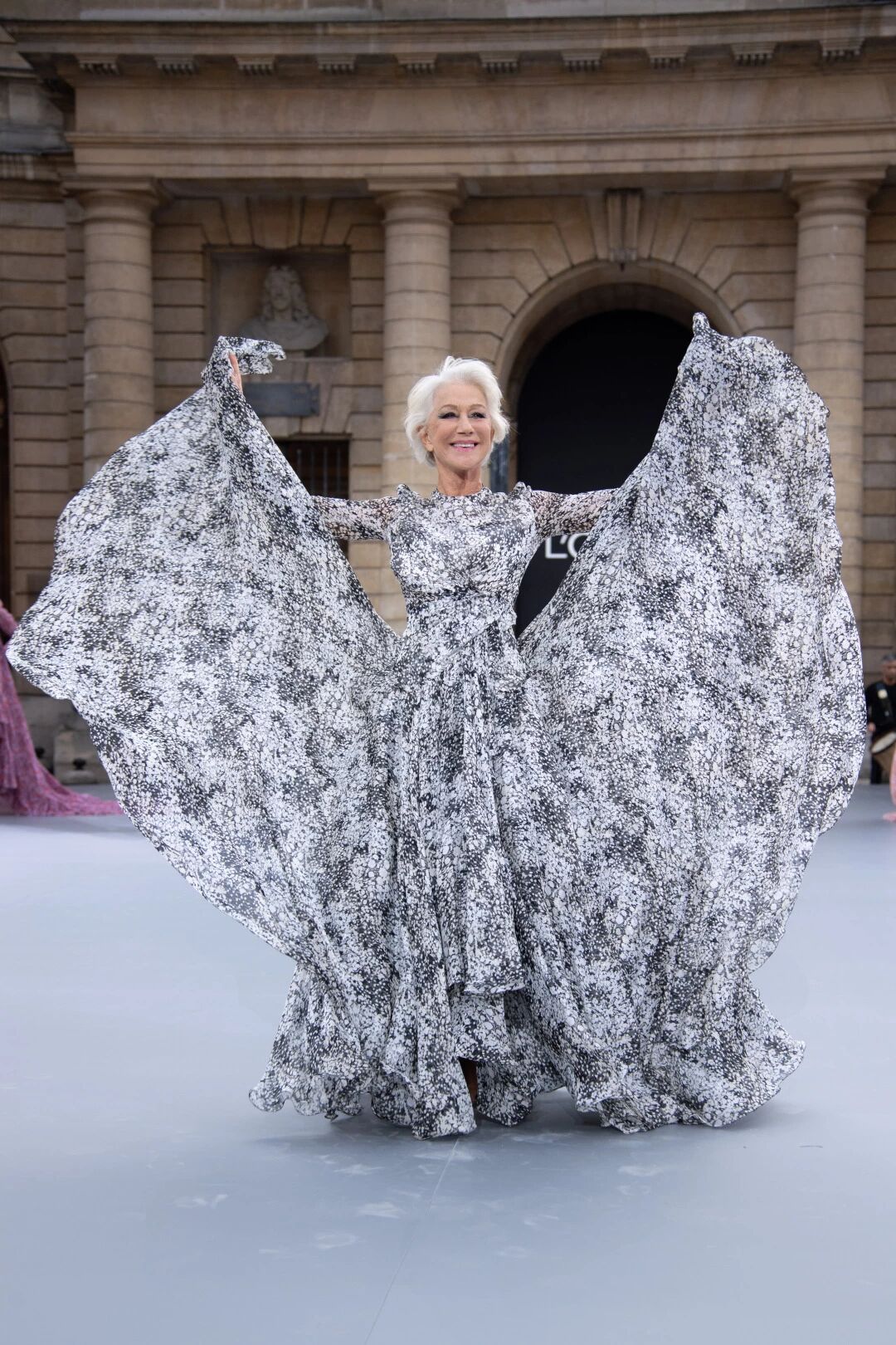 T 台上,Helen Mirren 褪去高跟鞋的束缚,以一袭黑 白印花图案设计的飘逸长裙和轻盈活力的步伐向世人展现美丽无惧年龄,宣告每个女性都值得拥有自己的美!