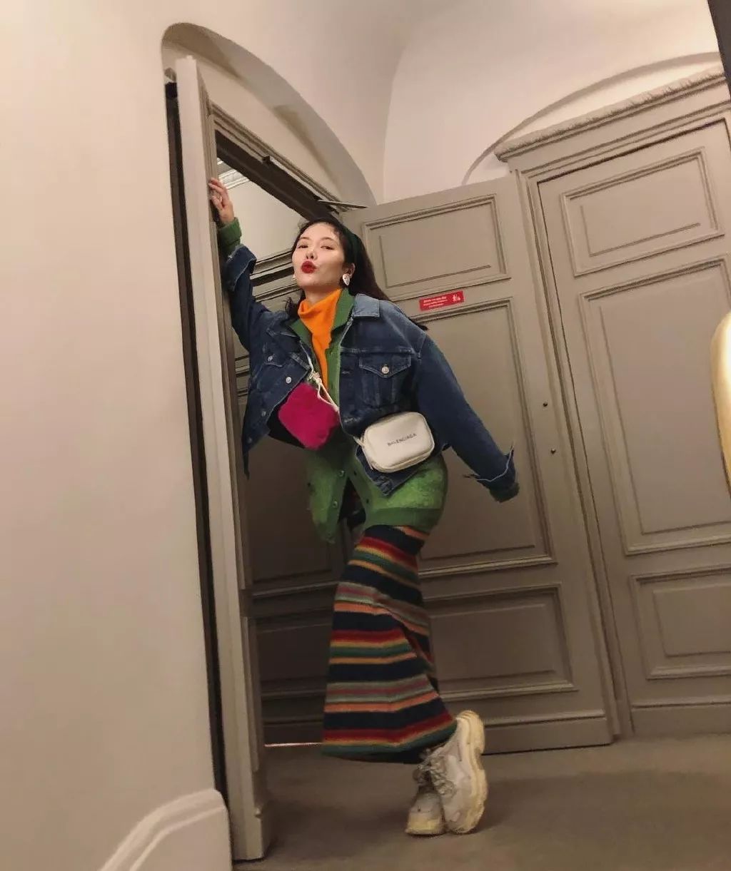 实在不行还有外套可以遮一遮,泫雅就在自己的彩虹针织裙外面套上一件牛仔外套。