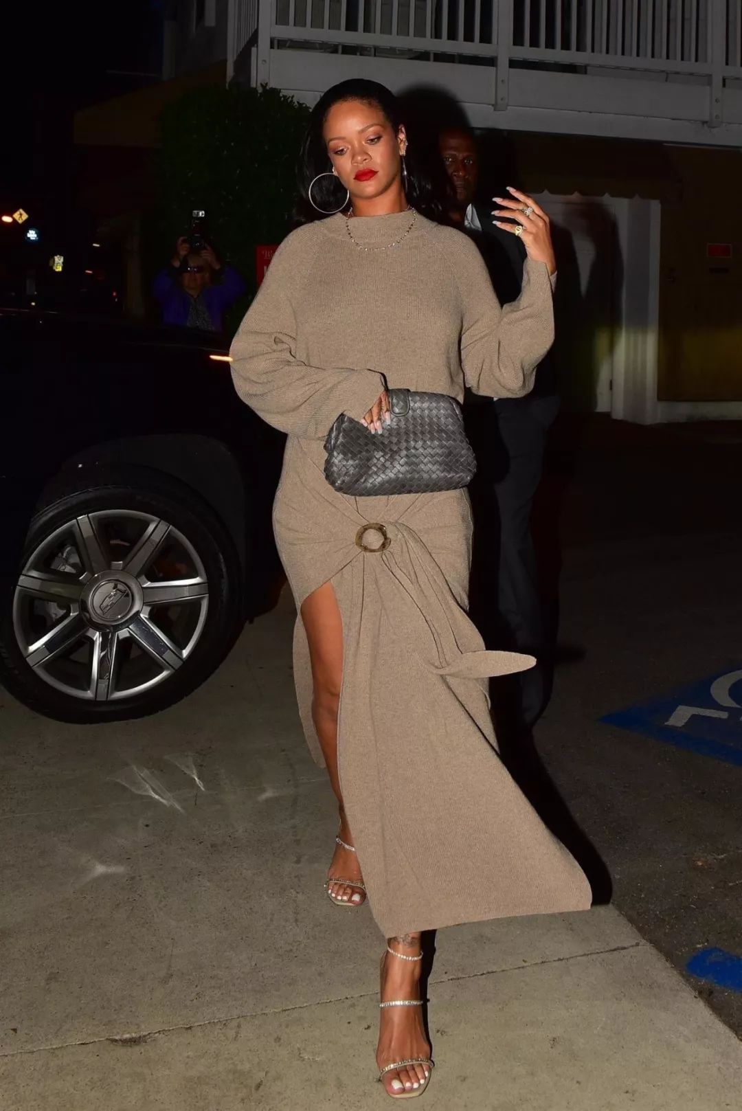 戚哥倒是经常翻牌针织长裙,这条晃眼的荧光粉针织修身长裙来自 Nicki Minaj x Fendi 联名系列,你一定很眼熟。