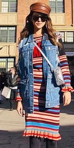 万能的牛仔外套可以遮住你觉得可能不够完美的地方,搭配条纹针织裙,效果真滴很不错。