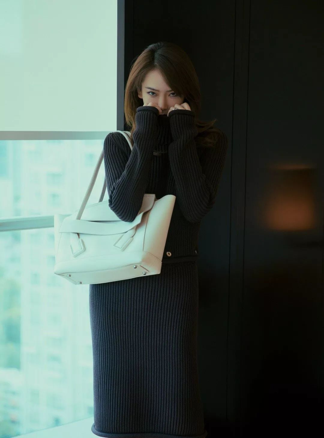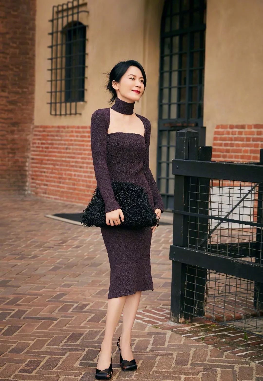就是这种全包身的裙子对身材要求比较高,你看,怀着孕的章子怡穿上修身针织长裙也毫不臃肿。