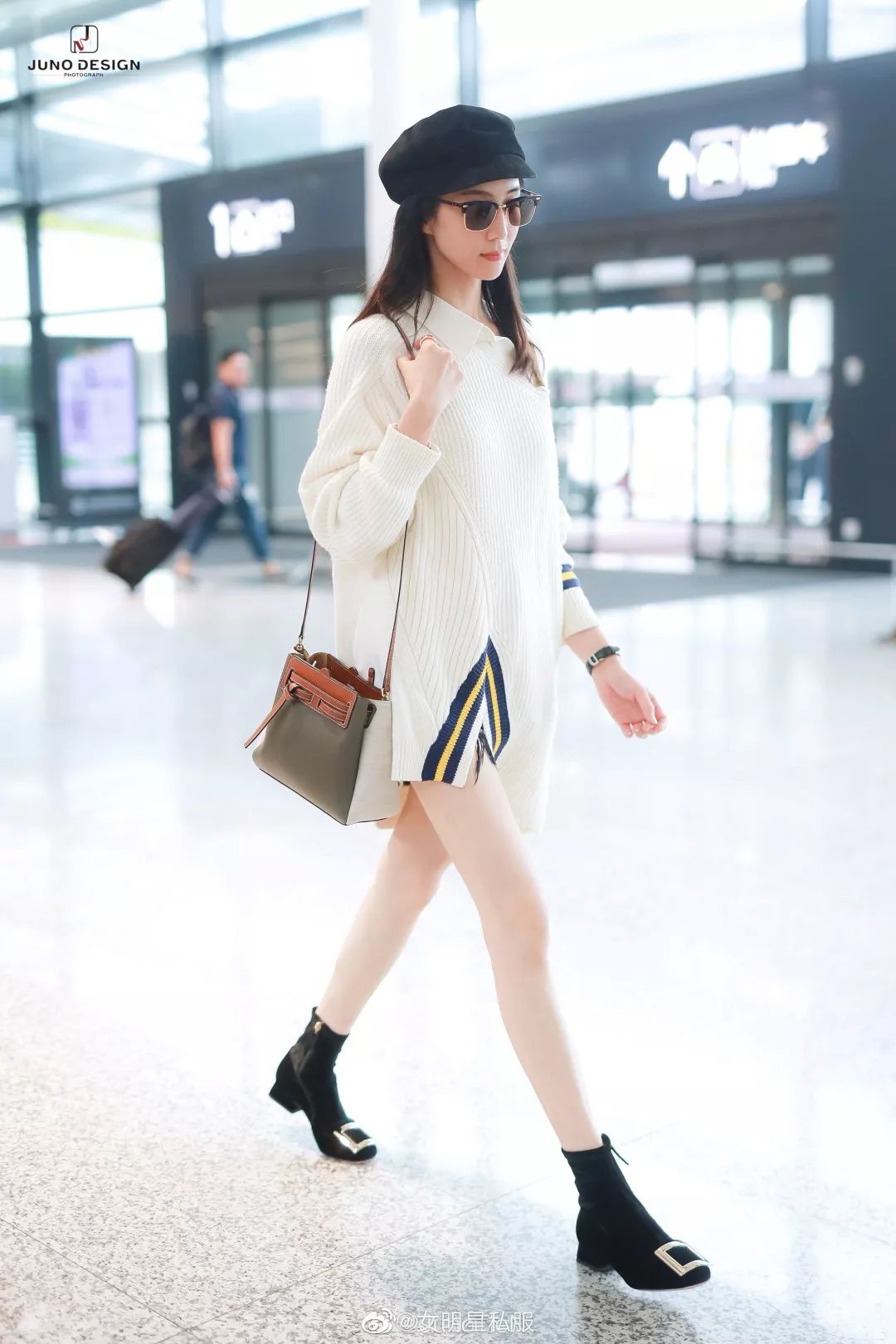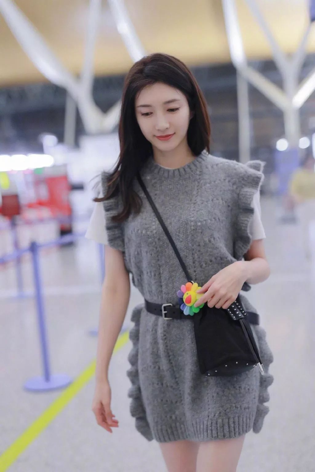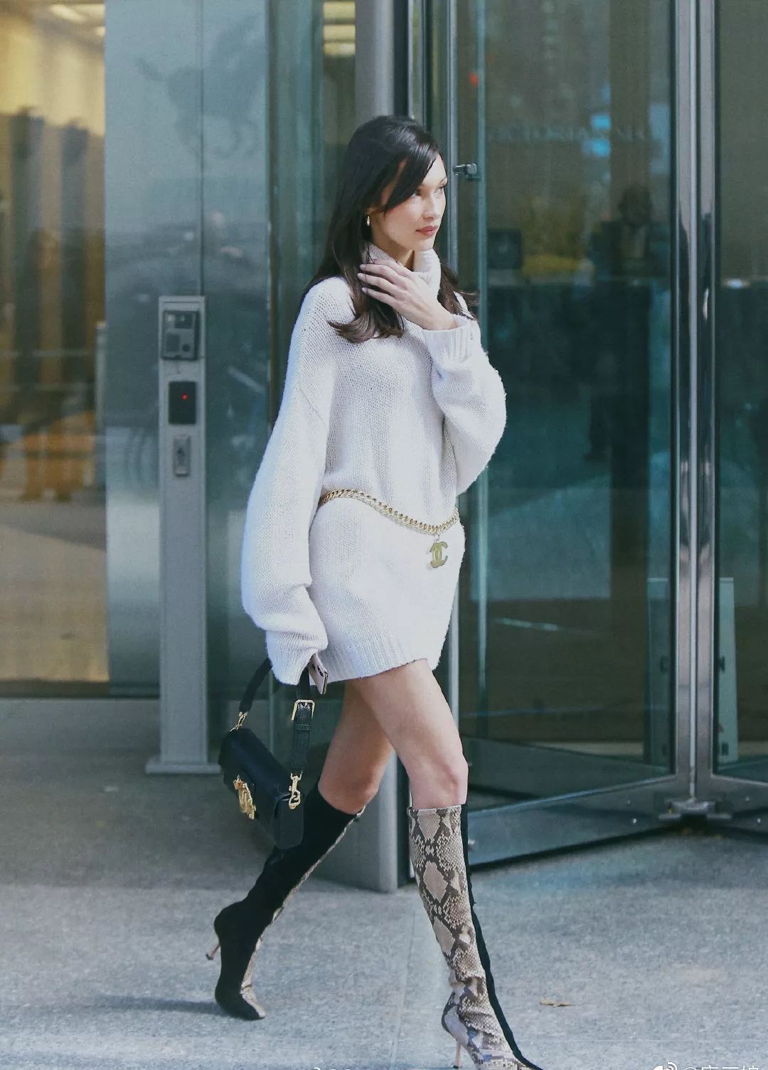 而且我们还不要忘记腰带这个显瘦神器,江疏影这件柔软毛绒绒的针织裙将她勾勒得温柔优雅,黑色腰带提高腰线位置,比一般的直筒针织短裙更实用。