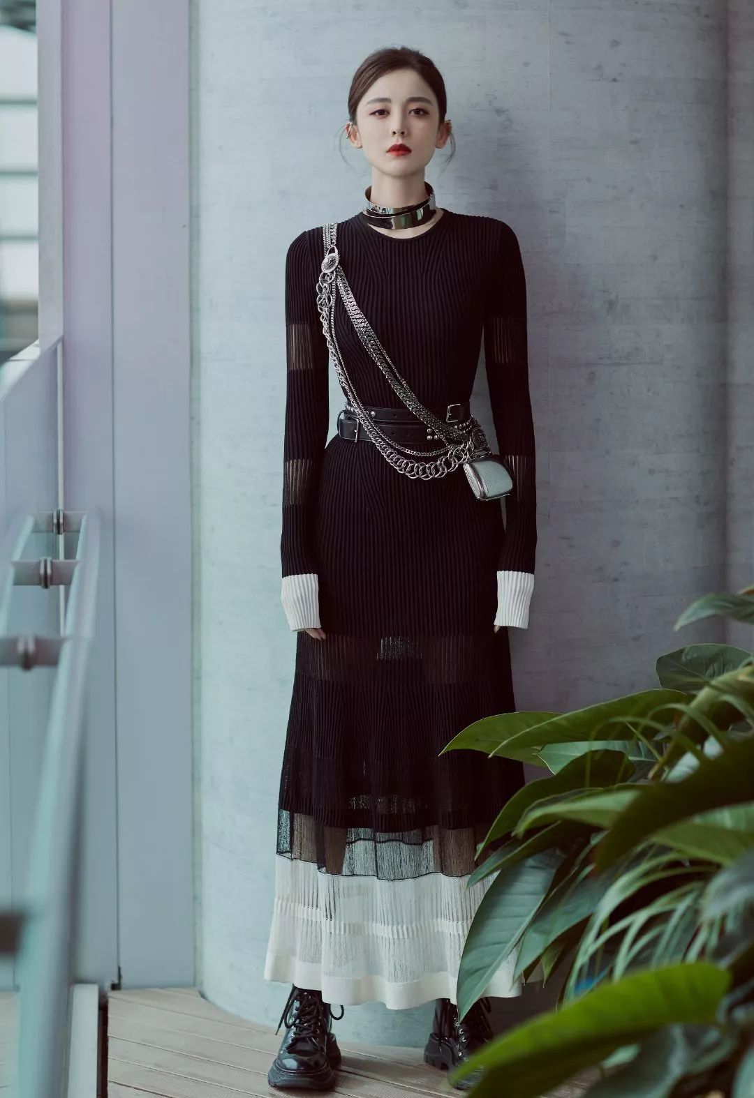 娜扎的黑色镂空长裙是一样的道理,金属链条的加入增添了硬朗的气息,像极了霸道女总裁,提升的腰线还更显性感。