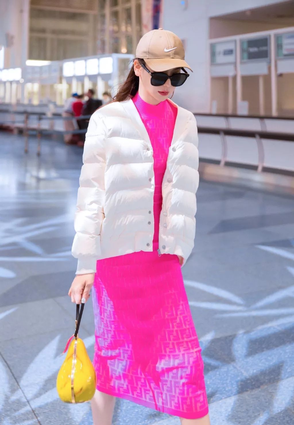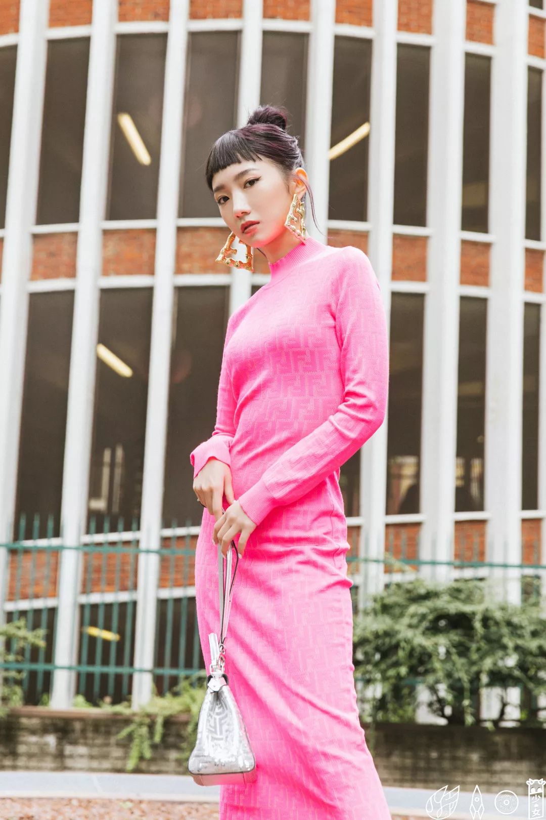 最后,像傅菁的这样树莓粉针织镂空连衣裙也能突显身材,腰部镂空的设计和下半身裙子A字的版型很有心机哦。