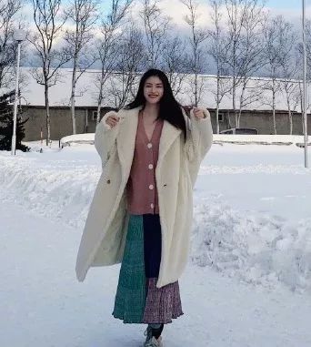 还有一个针织裙无敌的穿法——套装永远比连衣裙好驾驭。像何穗这样把粉色开衫针织半裙搭配到一起,再来一件白色泰迪熊大衣,潇洒!