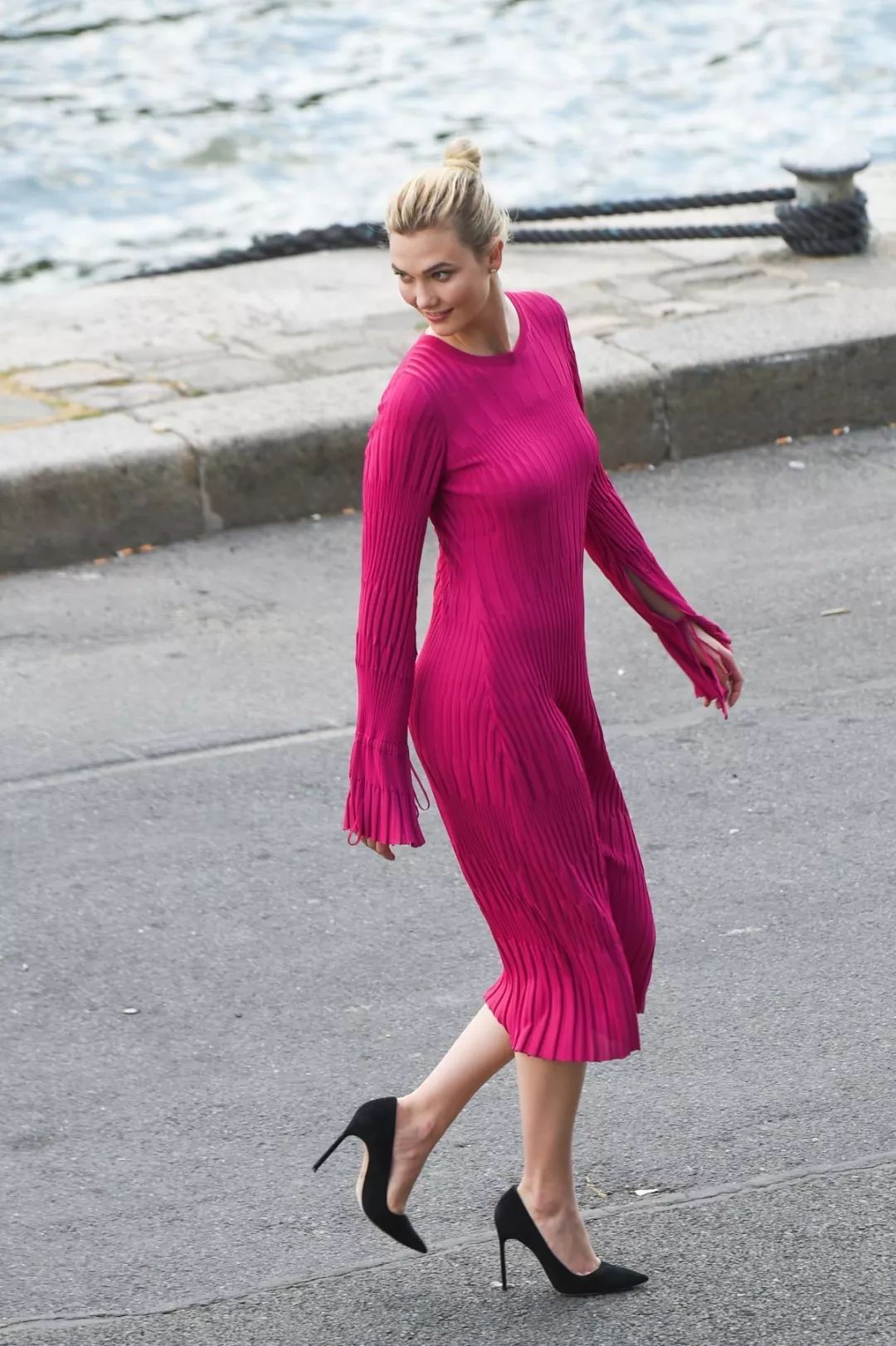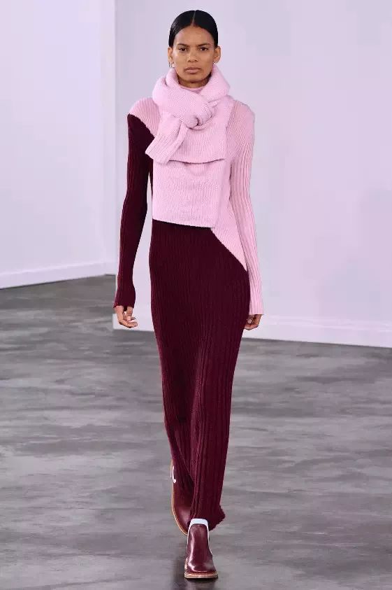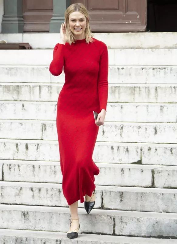 更不要说Karlie Kloss这样的超模了,一件玫红色的大长针织裙,很是霸气了。