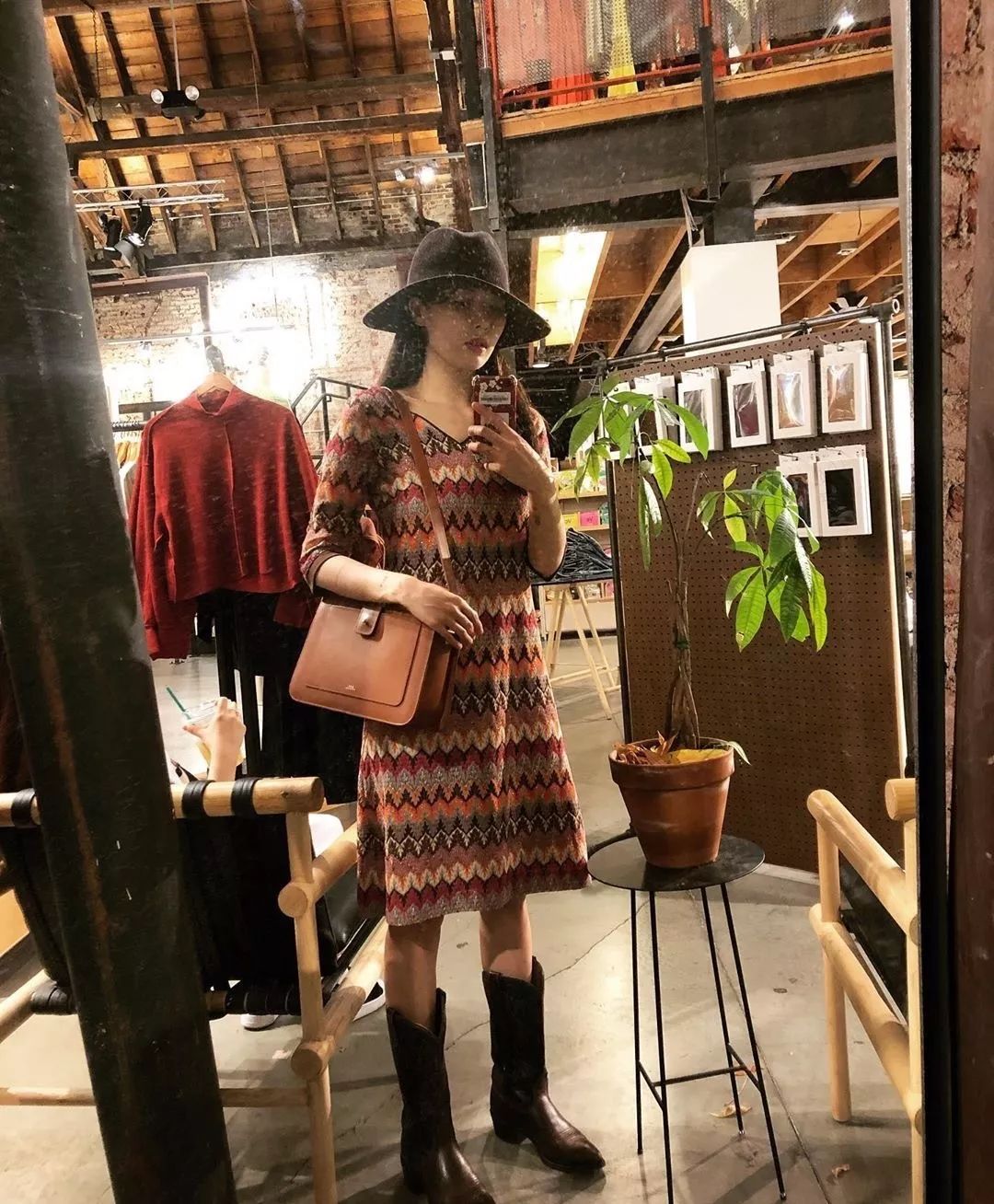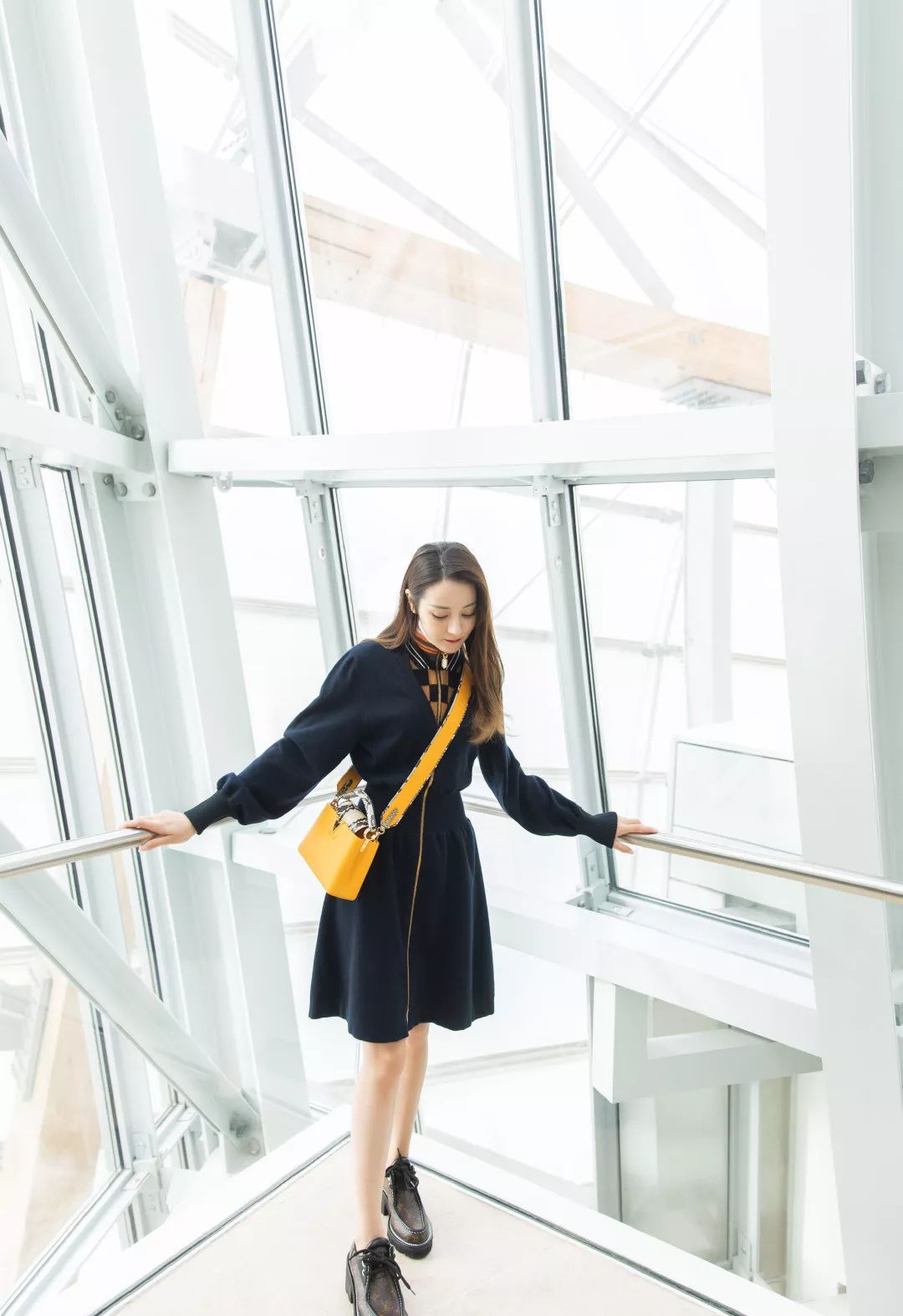 热巴的看展穿搭值得我们参考借鉴,针织连衣裙下摆宽松,搭配黄色斜挎包和棕色系带鞋,文艺又知性。