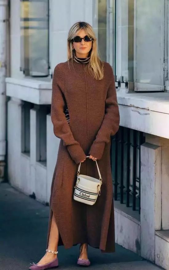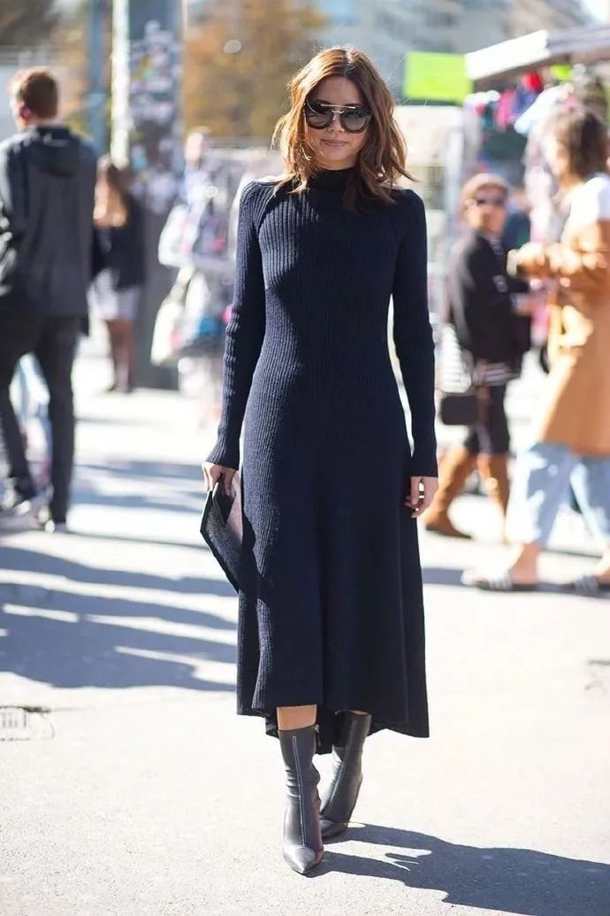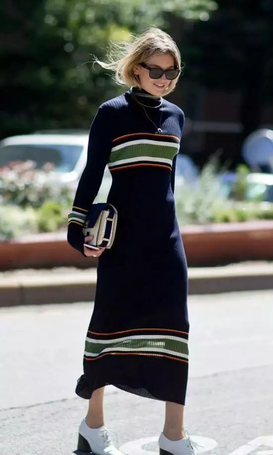 这样的开衩针织裙过膝但又不到脚踝,长度上没有那么拖沓累赘,也能盖住你的大腿赘肉。开衩针织裙能避免全包身长裙的沉闷感,让人把注意力转移到开衩的下摆。