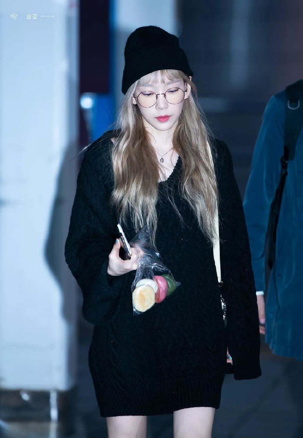 金泰妍近期机场私服选择了一件黑色的针织直筒裙,和同色系的毛线帽搭在一起可可爱爱,还有一点学生气。