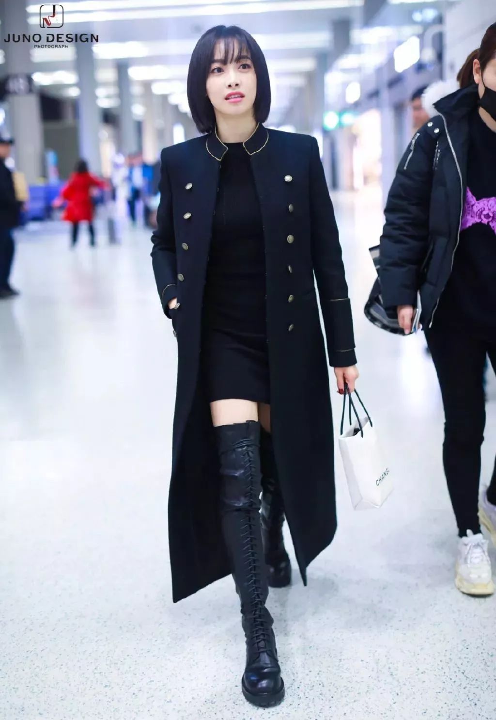 拿出硬朗的风衣外套穿在针织裙外面,柔中带刚,过膝长靴酷极了,今日份的宋茜走的是飒女孩路线~