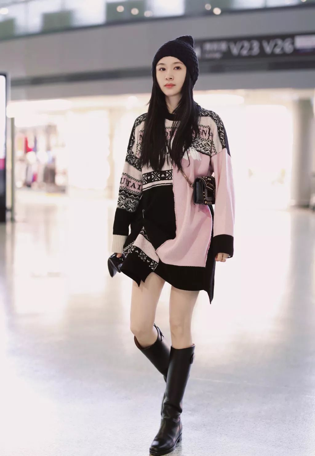 王子文就用长款拼色针织短裙搭配了长靴,温柔时髦,黑色针织帽又添温暖。