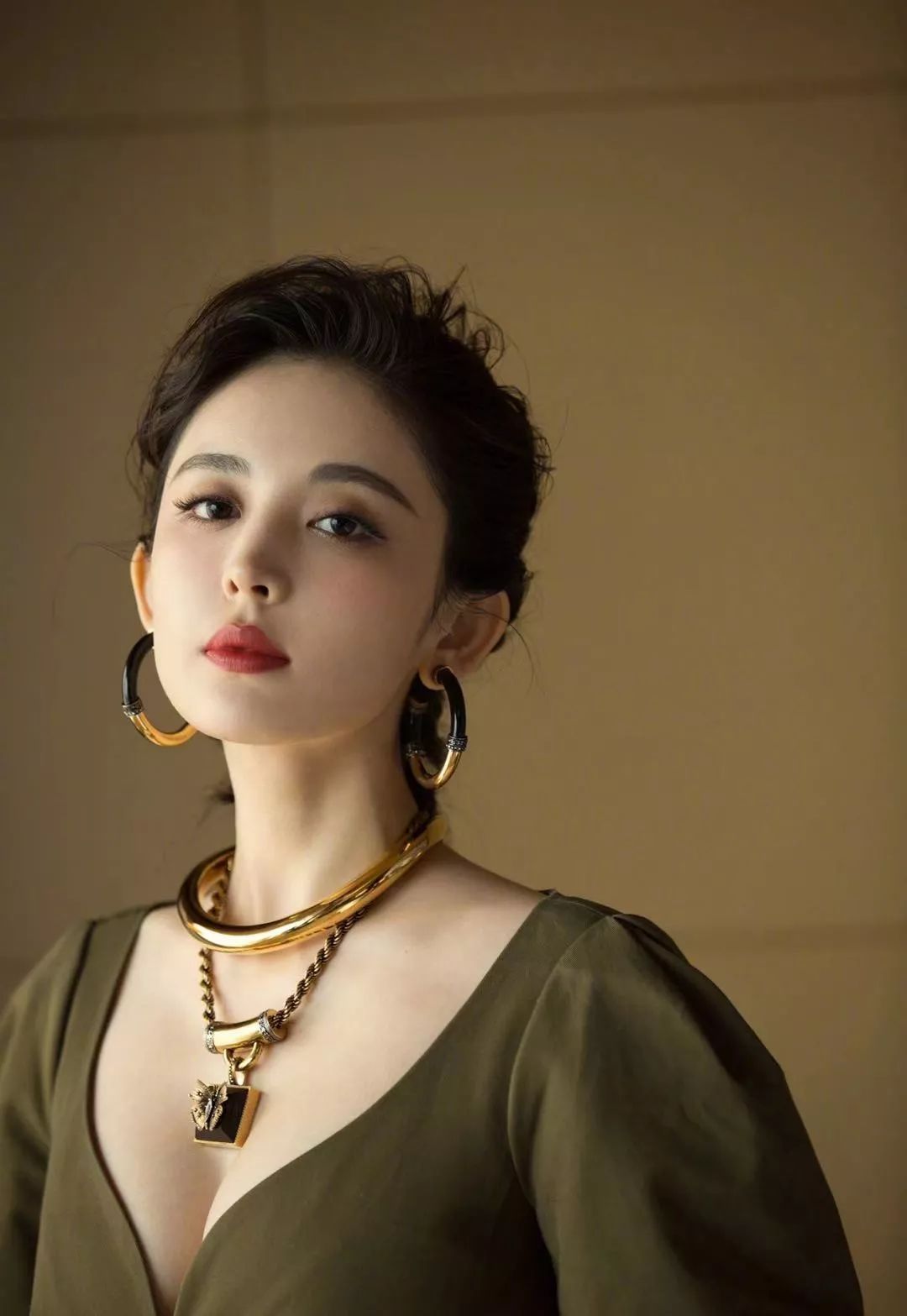 古力娜扎将发尾自然后拢,搭配微微大卷,额头全部露出,优雅大方,得体知性,你get了吗?