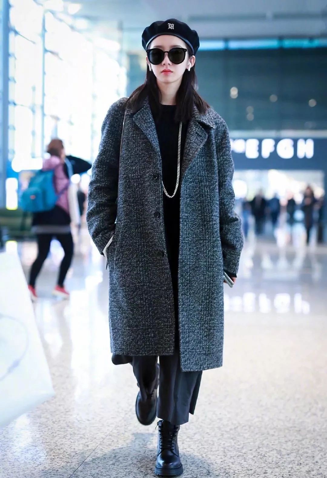 关晓彤这件大衣宽松廓形,自在随意,呢料抗寒防风,在冬日里出行披上一件大衣,戴上一顶帽子出门,也不用担心受寒冷的侵袭了。深棕色的大衣底色穿插上横竖插间有序的线条,俏皮的扣子趴在袖口与手腕之间,远远看去像深邃林夜中的一记灿烂点缀。