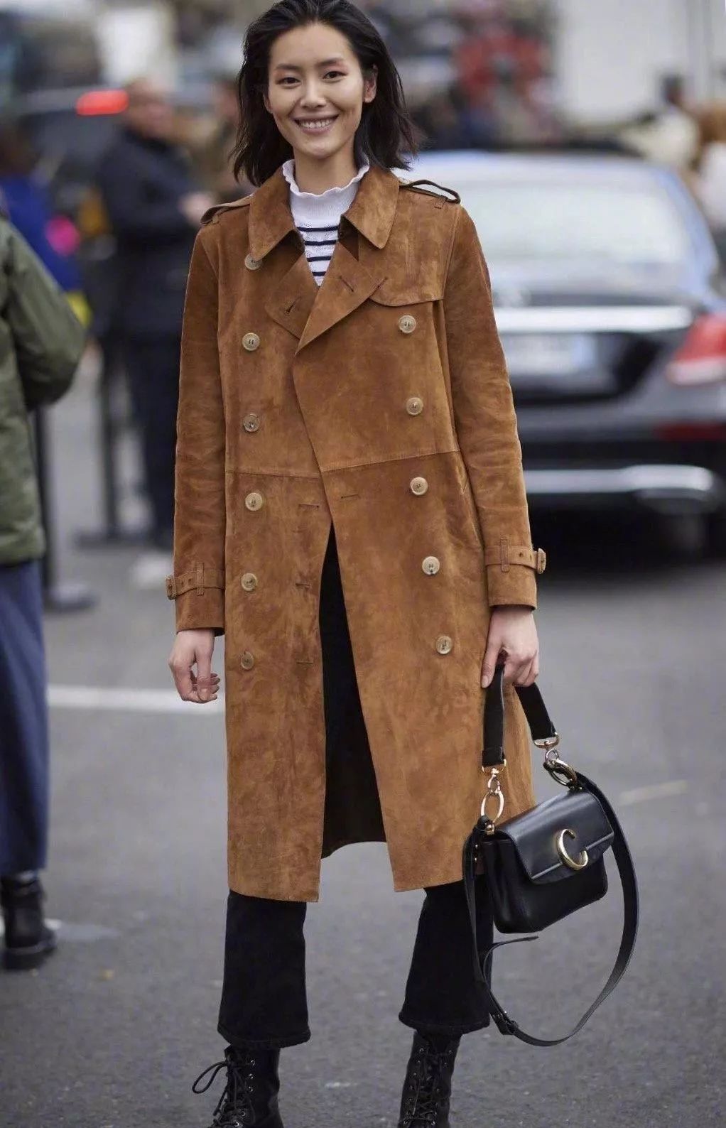 一身鹿皮绒大衣的刘雯,真是尽显了全身的好比例,大衣除了在颜色上变幻,在材质上的用心也不可小觑,柔滑的质感,双排扣双排扣口,不仅是穿着的便捷,更是时尚的变换理解。垂直而下的版型显近了如牛仔般自由洒脱的气质。