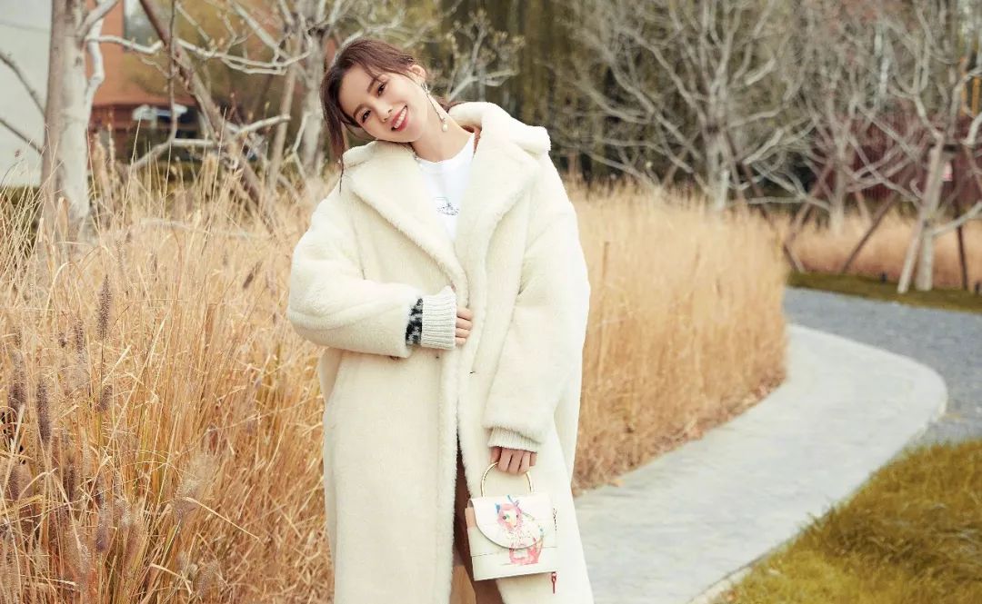 刘诗诗身上的奶白色羊羔绒连帽外套看起来温暖厚实,大翻领的设计让原本略显臃肿的羊羔毛外套多了一些轻便活力,白色的羊绒就像冬季里撒欢的小羊,愉悦又温暖。