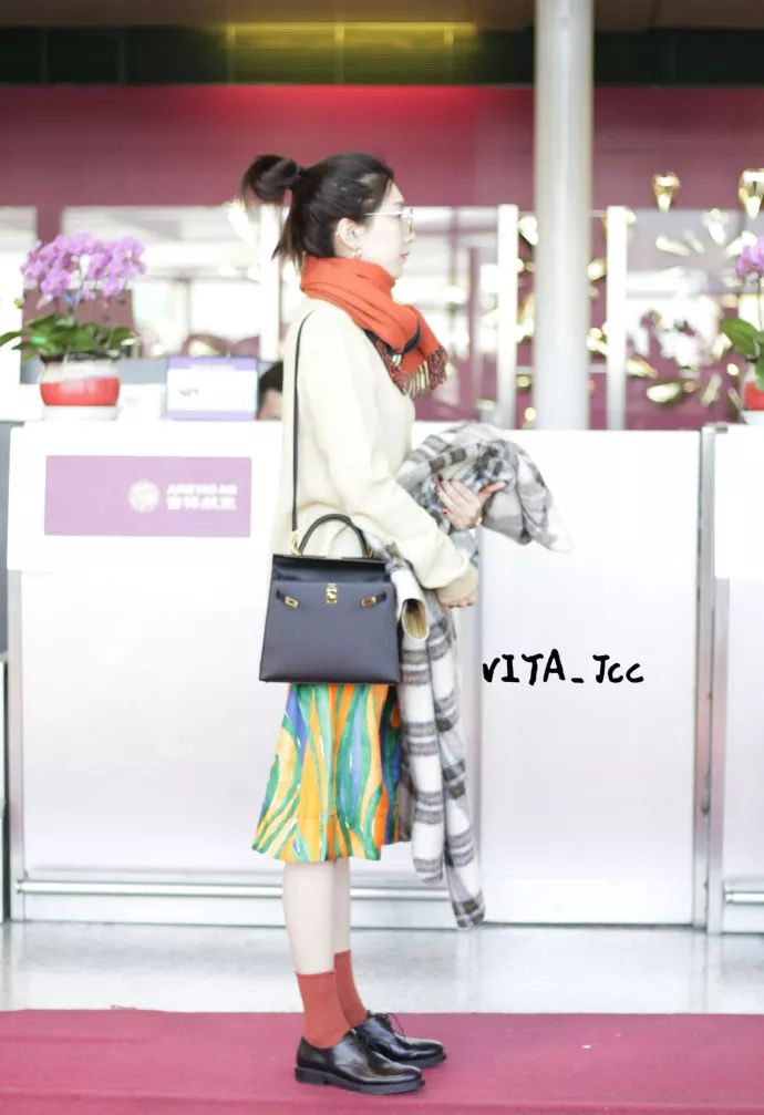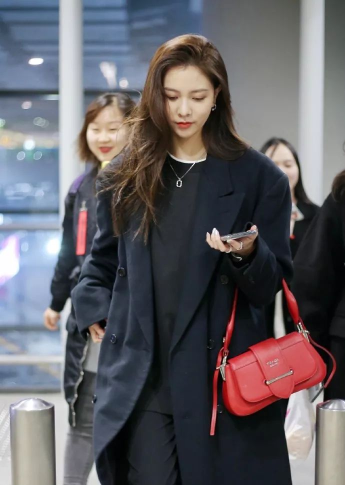 别小看配饰的作用,用它做好造型上的呼应,可以提升整个look的协调感和搭配感,江疏影就用了红色围巾和同色系中长袜,衬出温暖的冬日感。