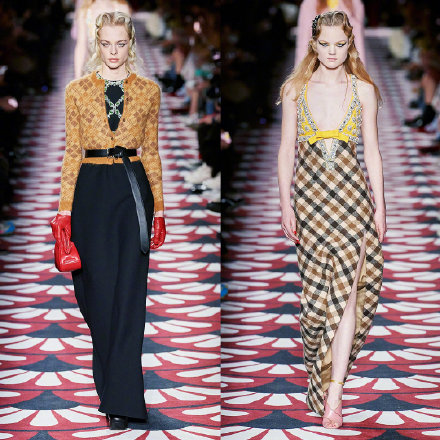 但这里没有怀旧之情。上世纪七十年代与更早的二十年代野蛮且激烈地交织在一起。Miu Miu的第一个造型是长及地面的褶皱缎面连衣裙,外搭着一件大衣。这是人们早晨醒来后的样子——Lady Day疲惫地走回家,肩上披着她演奏小号时穿着的外套。大秀在接下来的时间里也延续了这种紧张气氛——纯粹而欢愉的夜晚过后,黎明降临时突如其来的失落。Pixie Geldof和Rita Ora这种熟悉面孔的出现,更提升了这一概念的表现张力。整体布景亦是如此。帮Prada装饰秀场的小精灵们为何能一次又一次地将耶拿宫(Palais D'Iena)原本的艺术风格转化成令人叹服的新世界?真叫人好奇。