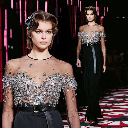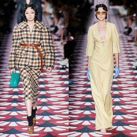 这一次,秀场采用了装饰艺术(Art Deco),就像一座宏伟的上世纪二十年代电影院一样,映射出服装剪裁的慵懒腔调,又或是标志性的好莱坞女郎风格,像身着针织连体衫的Bella和Adut那样。不过,当Kaia Gerber穿着一条黑色简约长裙和水晶饰透明上衣出现时,你会发现,这不是上世纪二十年代的风格,取而代之的是Miuccia对三十年代的想象,就像她上周刚发布的另一个时装系列一样。上世纪三十年代:一个庞大的社会遗留问题,一个全球性灾难的培养皿。Miuccia Prada在2020年秋冬季尾声将至之时,引发了人们的共鸣。这种魅力攻势的确让人难以抵挡。