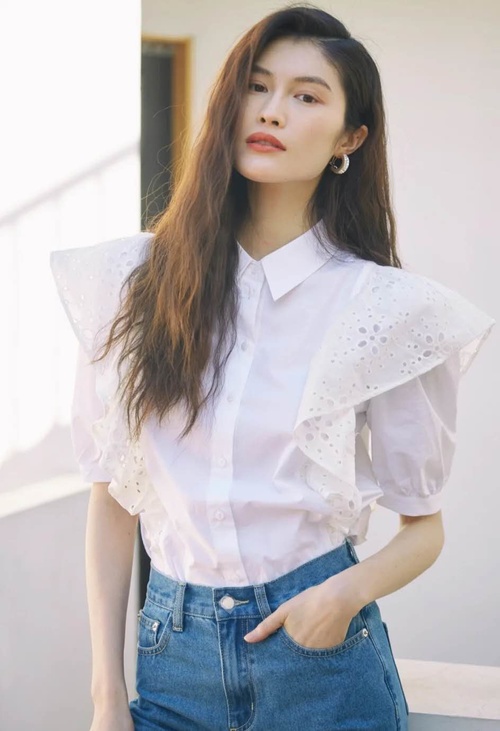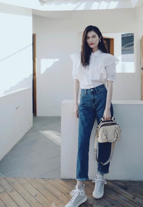 何穗在她的白衬衫推荐中就便提到了这件,荷叶边与泡泡袖的双重设计,穿上显得和立体很精神,简直是仙女本仙,搭配高腰直筒牛仔裤也是很ok的!