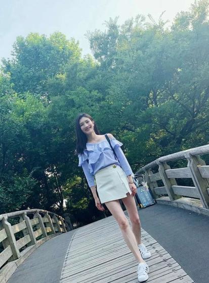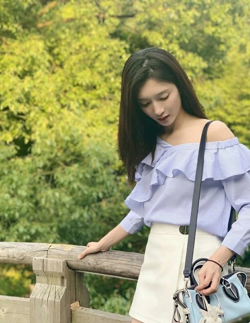 再看江疏影这套蓝色荷叶边衬衫搭配白色短裤,露肩设计大秀锁骨与肩线,白色短裤凸显大长腿,除了好看我还能说什么呢?