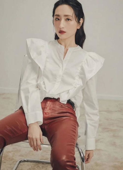 《想见你》的女主柯佳嬿in DAZZLE,一身荷叶边衬衫搭配红棕色皮裤,酷帅酷帅的,超时尚超有feel~