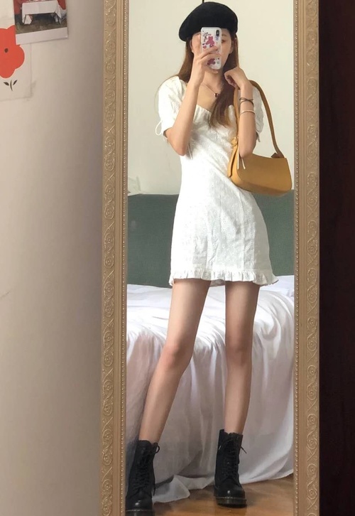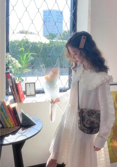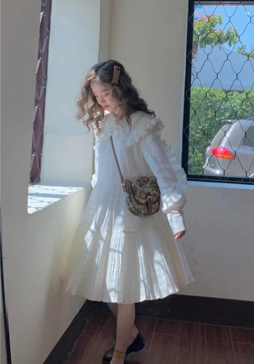 这一套同样也是白色连衣裙,但是跟上一套的感觉是不是完全不同呢?她采用的是娃娃裙的版型,领间是大大的双层荷叶边设计,袖子上也有小花边,穿上去就是可爱学院风和宫廷风的感觉,满是仙气的小公主呢~