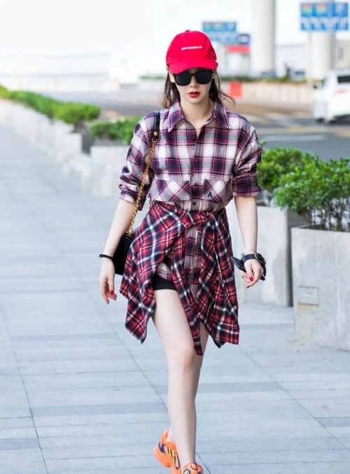 时尚达人戚薇向大家分享的机场穿搭,以格纹衬衫为主题,叠穿look,这件的重点在哪里呢?格纹衬衫系在腰间,不仅可以提高腰线,也丰富了视觉上的层次感,气场一米八!冷了就披上,热了就脱下系在腰间,不用拿在手上,一点都不累赘~