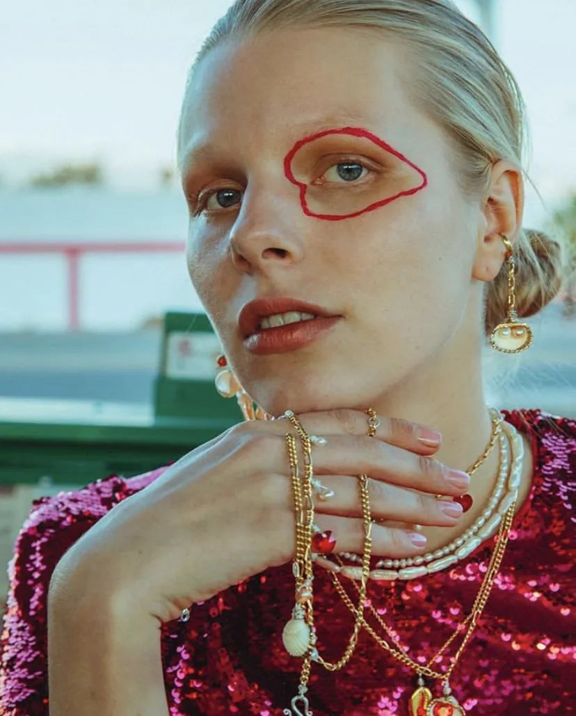与前面那些走简约优雅路线不同的是,Simone Rocha用人造珍珠串成花朵形状的耳环、发箍,再点缀以剔透的红、蓝人造宝石,让珍珠回归到Empire Style的华丽。